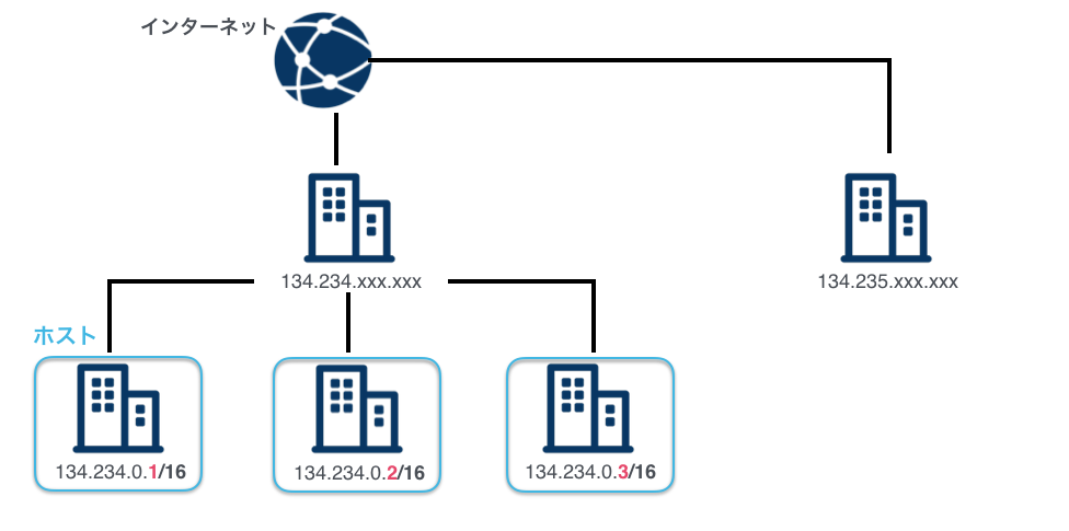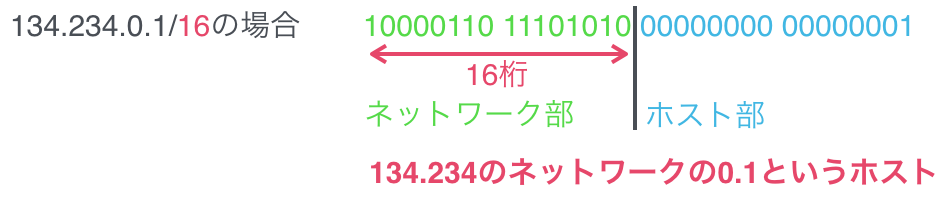 なお134.234.0.1/16が存在する134.234というネットワークの中には134.234.0.0 ~ 134.234.255.255のホストが存在することができます。