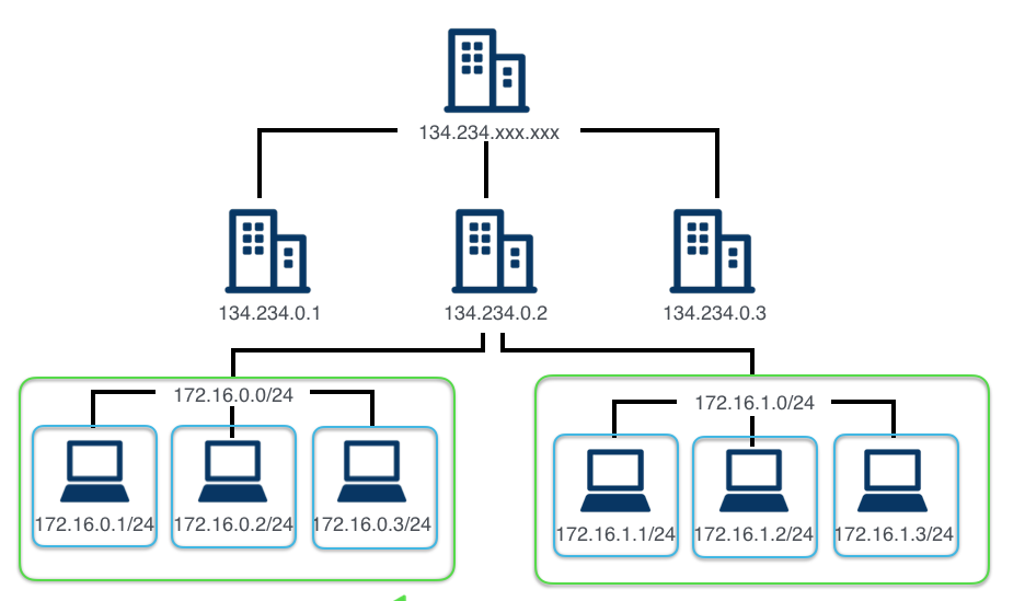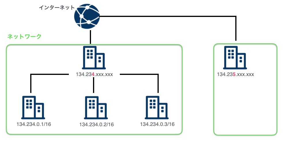 緑で囲われた部分がネットワークとします。 この場合、ネットワークが異なると134.234と134.235のようにネットワーク部の値が異なります。