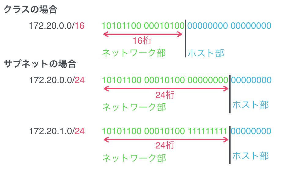 | ホスト部 | 下位24ビット | 下位20ビット | 下位16ビット |