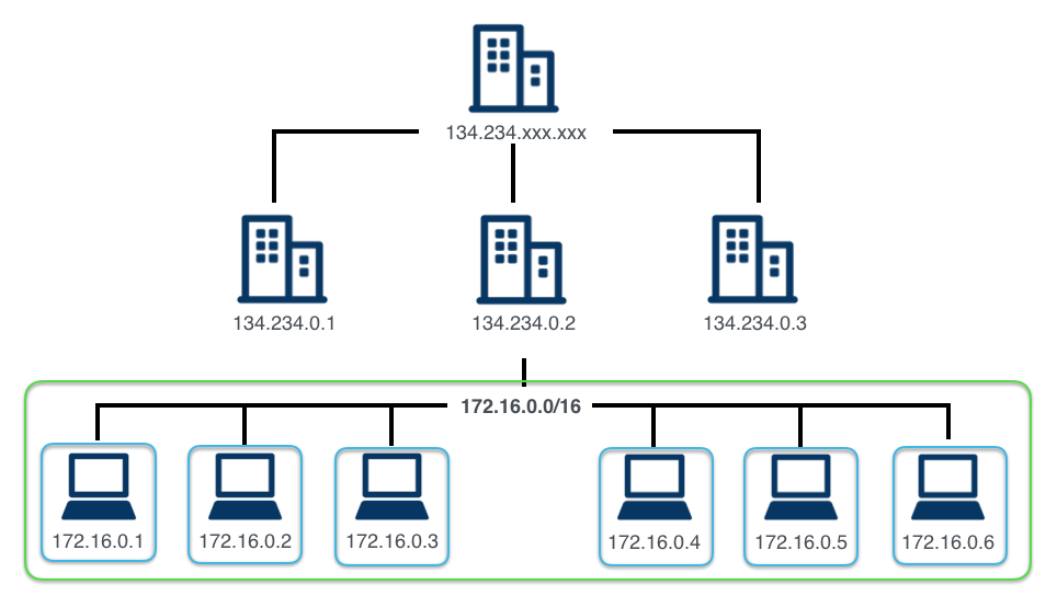 例えば、134.234.0.0/16というIPアドレスは132.234.xxxx.xxxで表現される134.234.0.0から134.234.255.255のホスト(厳密にはネットワークアドレスとブロードキャストアドレスをのぞいた134.234.0.1から134.234.255.254)が存在するネットワーク自身のことを指します。