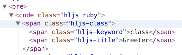 実際のHTMLを見てみると以下のようになっています。つまり、マークダウンでソースコードを書くとpreタグとcodeタグで囲われる形になります。