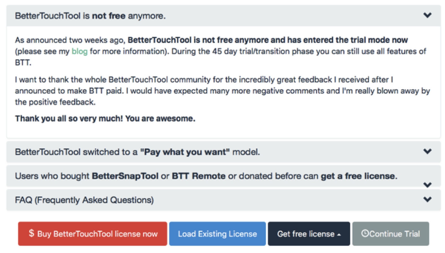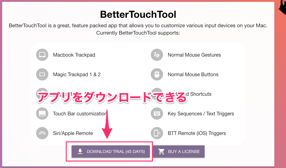 しかし、このアプリですが、BetterTouchTool(BTT)とBetterSnapToolという似たようなアプリが存在していたり、ライセンスの購入方法が特殊であったりと購入の手続きがわかりにくいものとなっています。