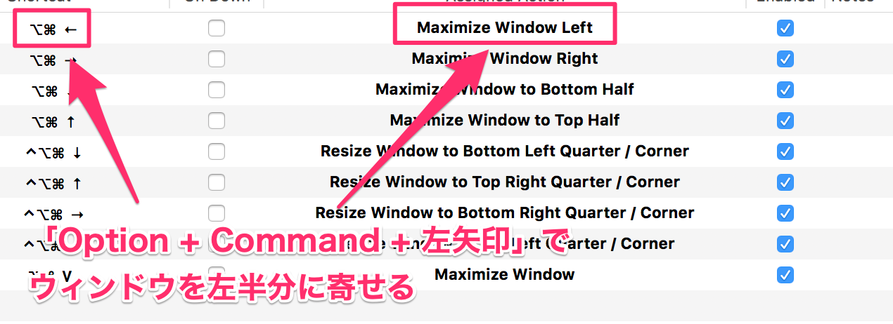 | ⌥ ⌘ ← | Maximize Window Left (ウィンドウを左半分に寄せる) |