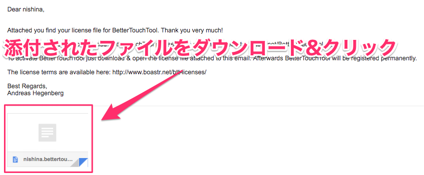 そして、BetterSnapToolもしくはBTT Remote Controlからライセンス取得を実行すればメールが届くので、添付されたファイルをダウンロード&クリックすればOKです。