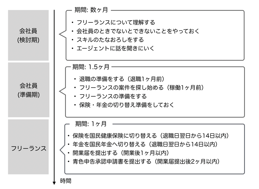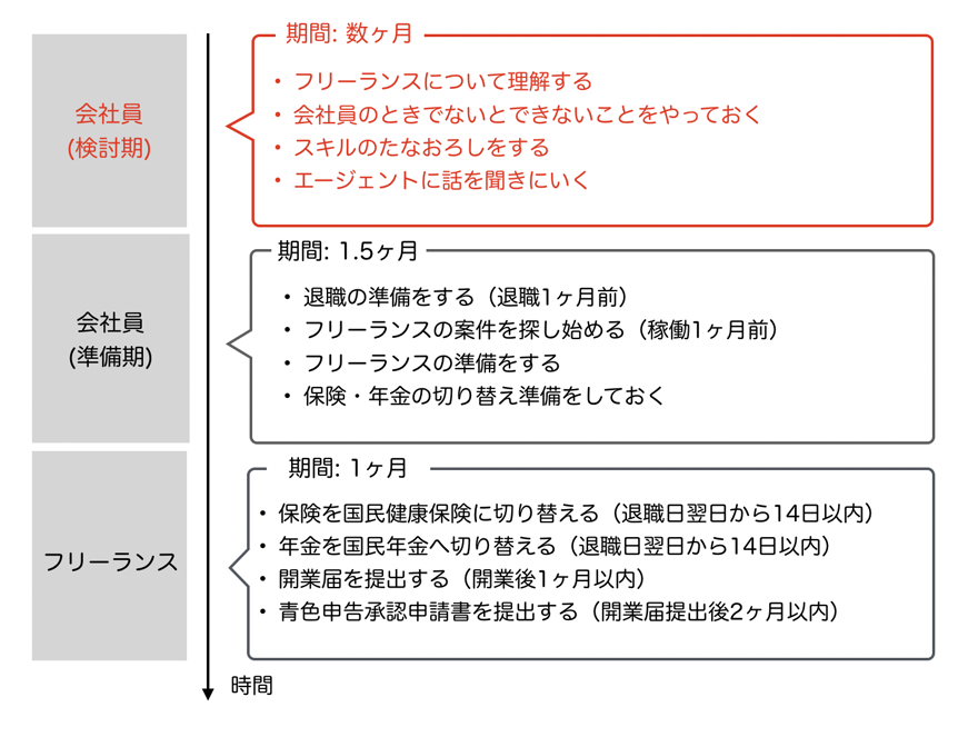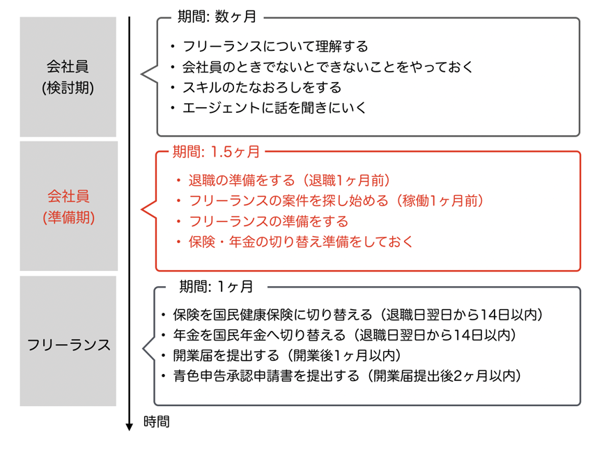 今回は『会社員(検討期)』『会社員(準備期)』『フリーランス』という3つの時期に分けて、やることをまとめました。