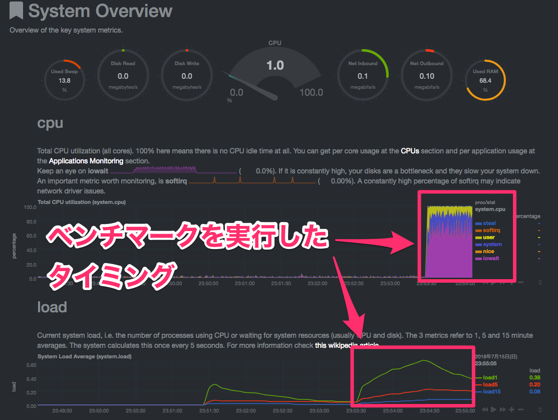 では実際にベンチマークを実行してnetdataの画面を確認してみます。