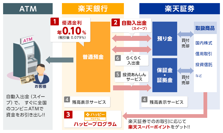 マネーブリッジとは楽天銀行と楽天証券の口座を連携し、自動で入金や出金を行うことができる設定のことです。