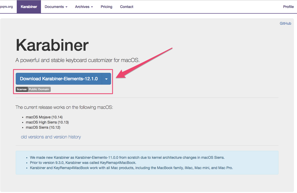 Karabiner-ElementsはKarabinerの特設ページが用意されているのでそちらからダウンロードができます。