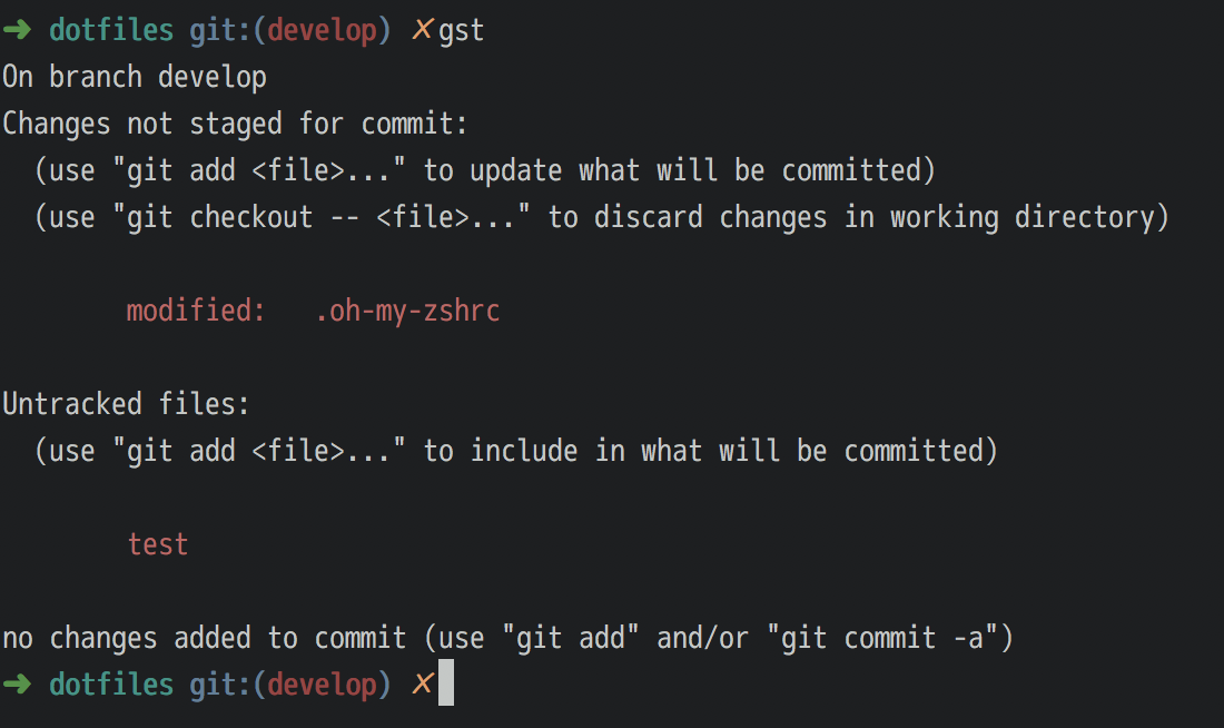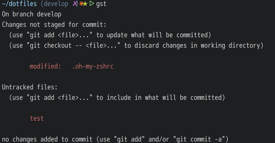 Gitのブランチ名やGitのコミット状態、現在のディレクトリなどがパッと見てわかりますし、gstでgit statusコマンドを叩くようにエイリアス(= ショートカットキー)も設定されています。
