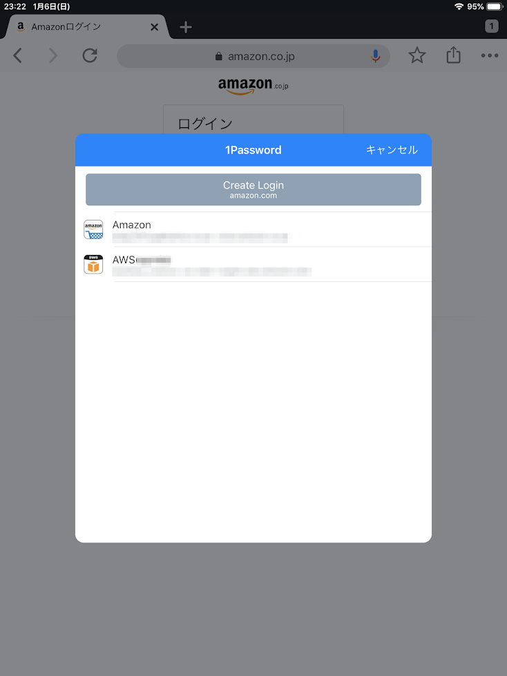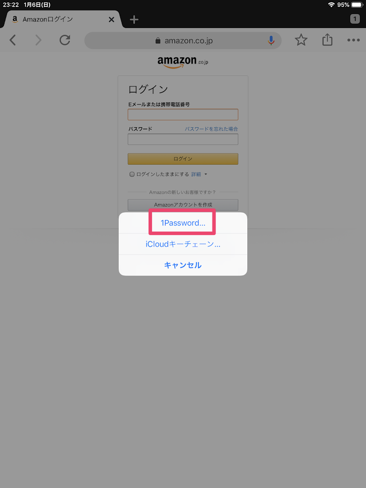 ここでは例として、すでに1Passwordにログイン情報が記憶されているAmazonを利用します。