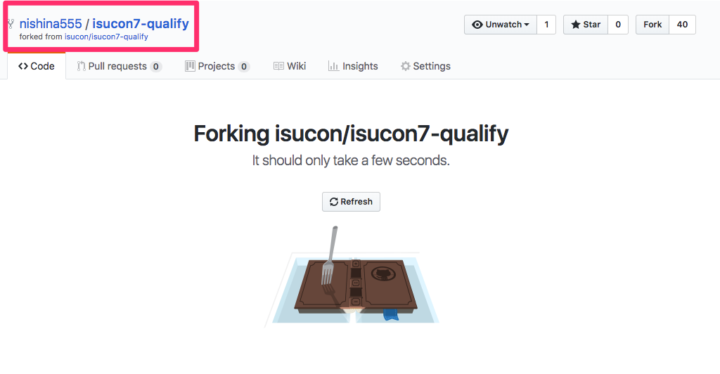 これで自分のアカウント(nishina555)にISUCONのリポジトリ(isucon7-qualify)が作成されました。