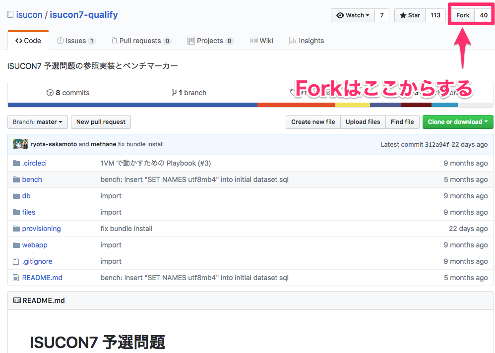 リモートリポジトリの向き先を自分のアカウントに変更するため、本家のリポジトリをForkして自分のアカウント配下にISUCONのリポジトリに持ってきます。