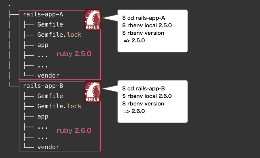 そして、『アプリAのrubyのバージョンは2.5.0、アプリBのrubyのバージョンは2.6.0』というように、Railsアプリごとに異なるrubyのバージョンを利用したいとします。