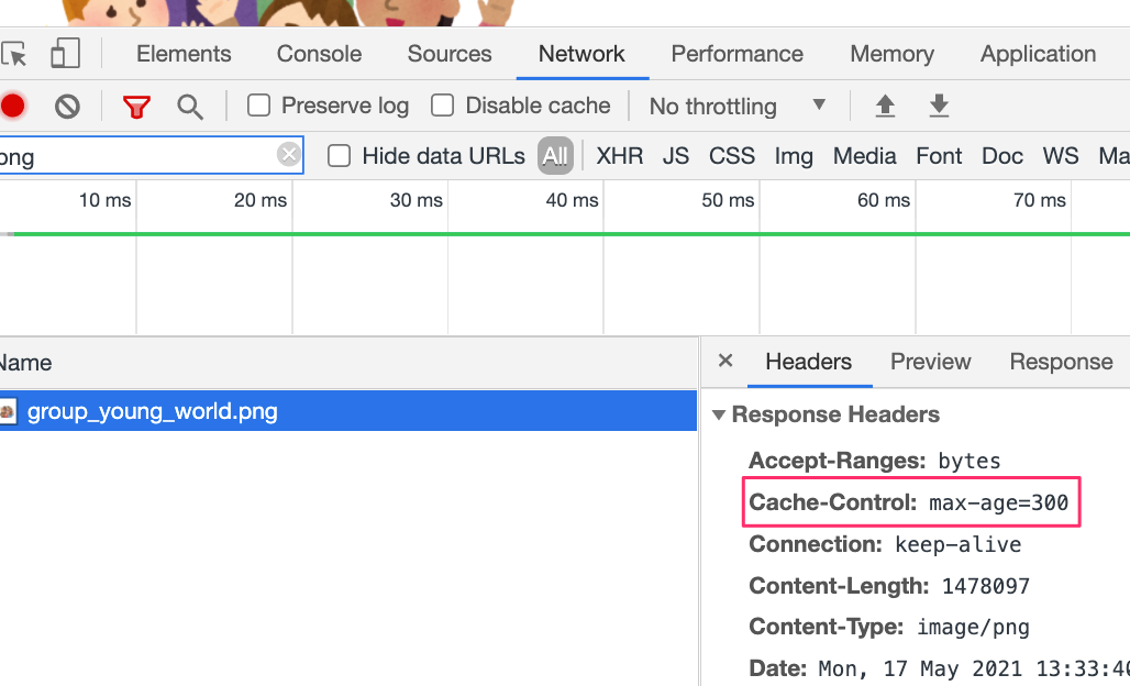 画像のレスポンスヘッダを確認すると先ほど設定したキャッシュ時間(300秒)が反映されていることがわかります。