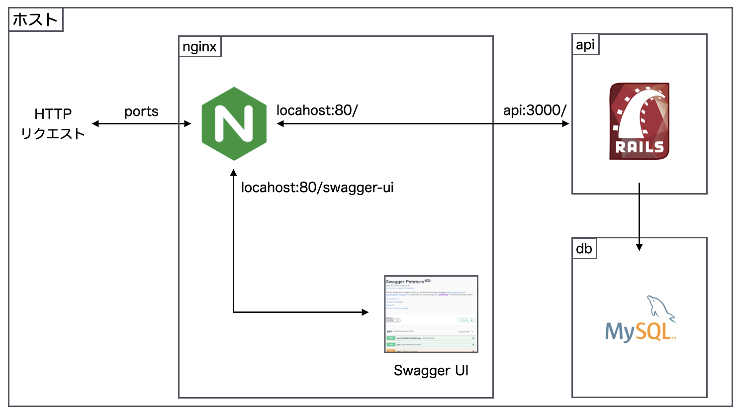 - nginxを利用することでSwagger UIとAPIを組み合わせる