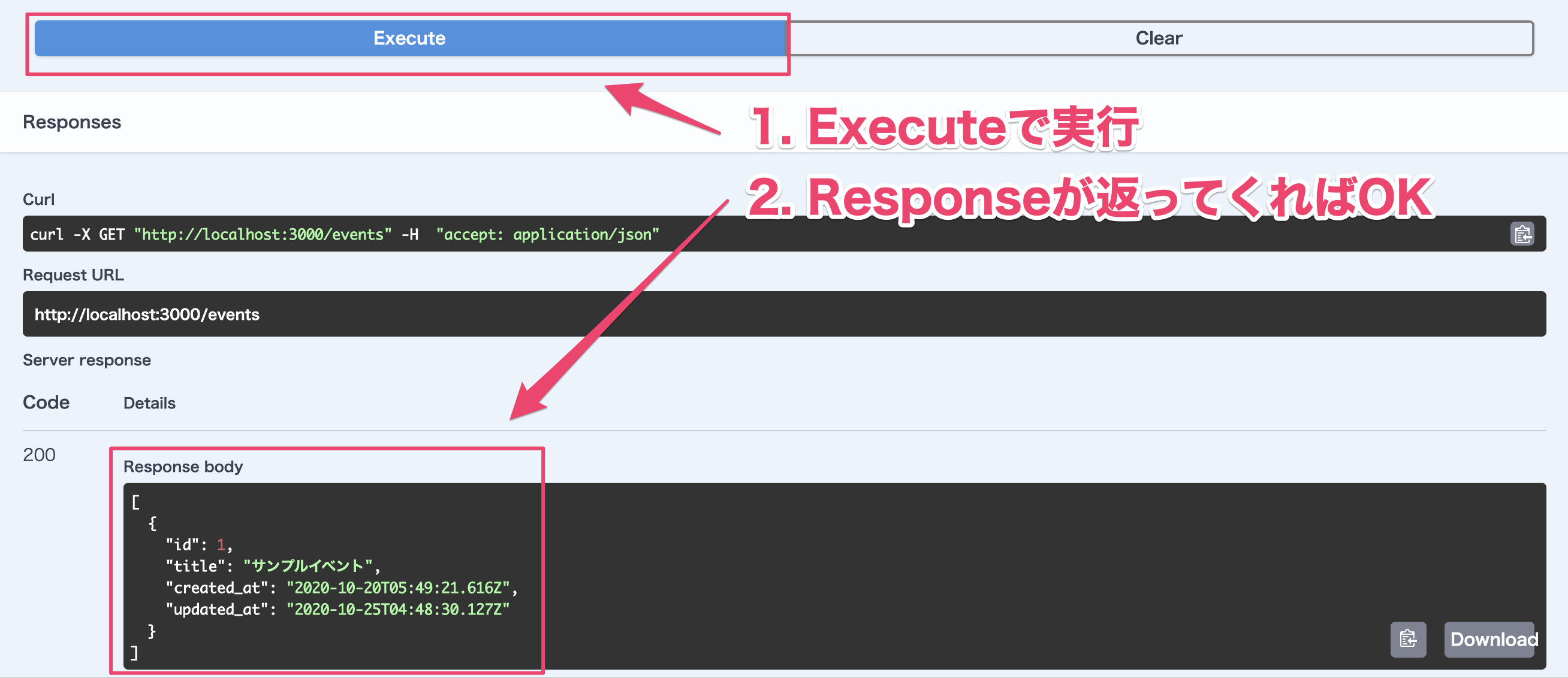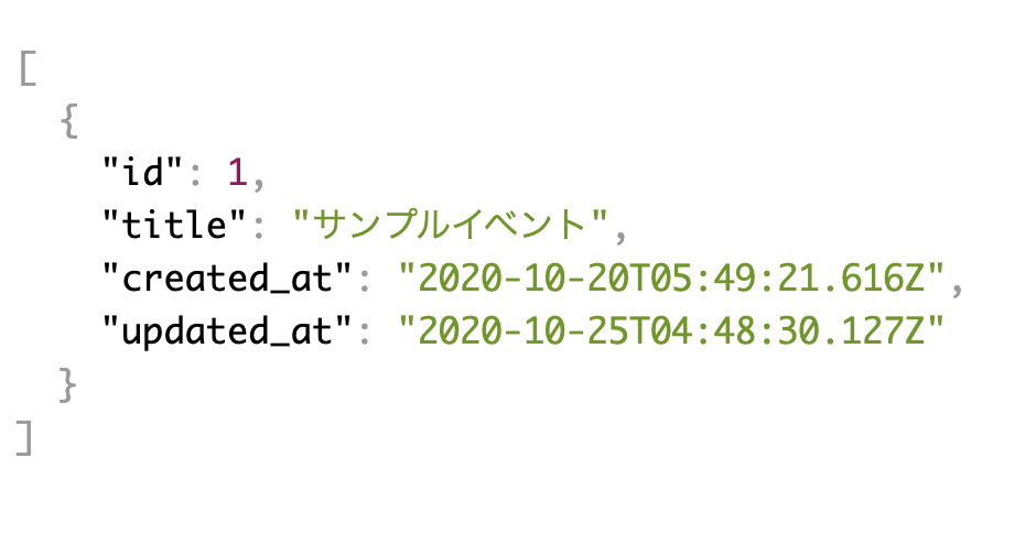 localhost:3000/eventsにアクセスして以下のようなレスポンスが返ってくればOKです。