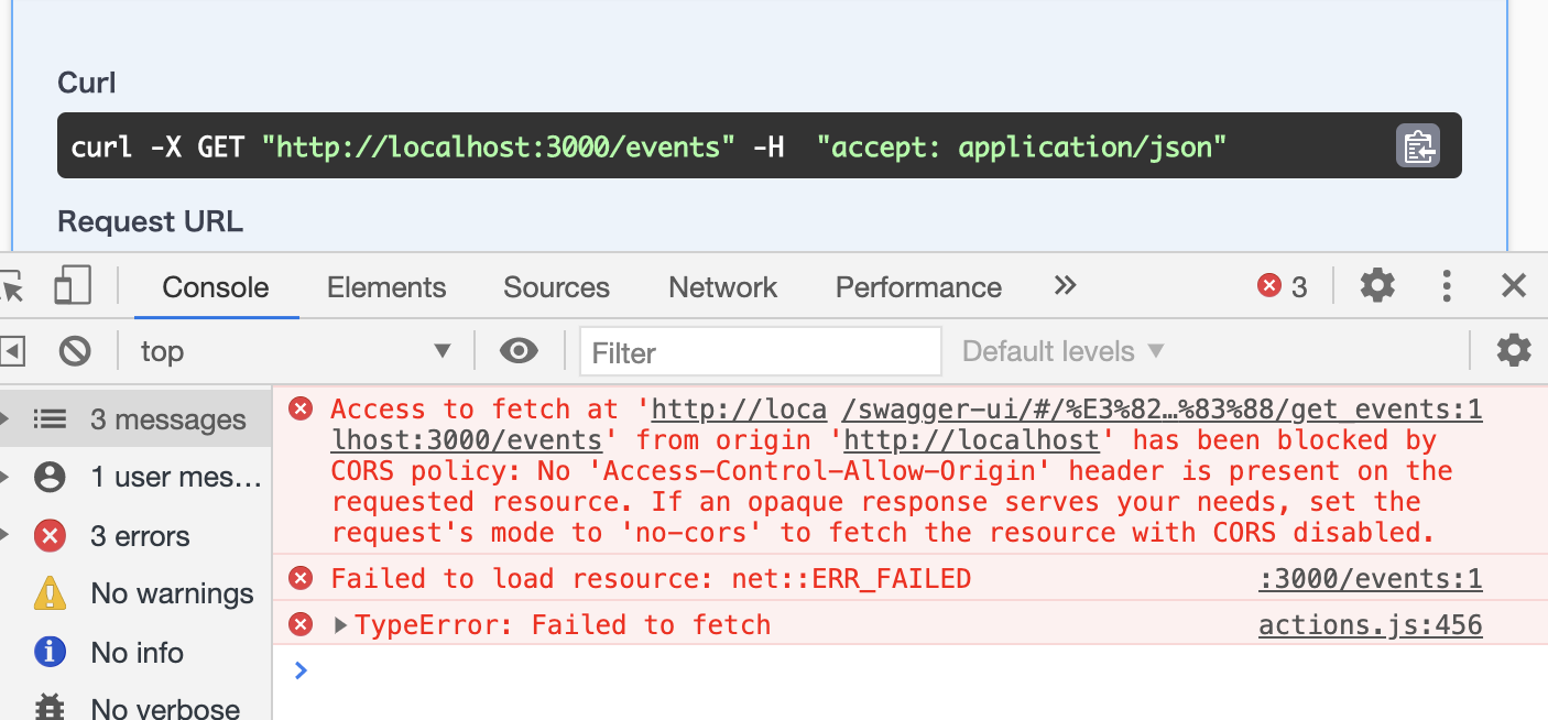 この状態でSwagger UIからAPIにリクエストを送るとオリジンをまたがっているためAccess to fetch at 'http://localhost:3000/events' from origin 'http://localhost' has been blocked by CORS policyというエラーが発生します。