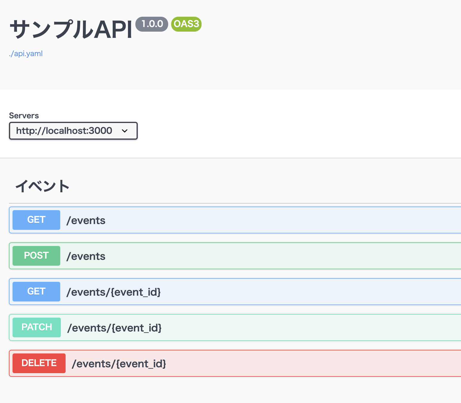Swagger UIはlocalhost:80、APIはlocalhost:3000で起動しています。