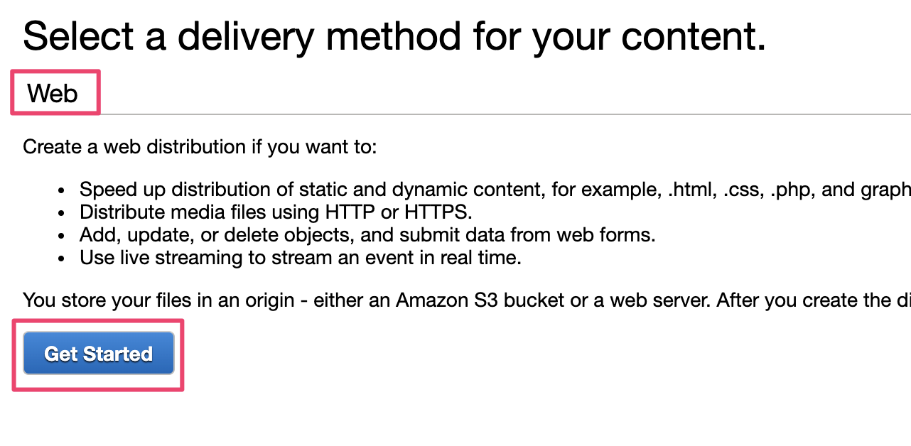 CloudFrontのダッシュボードを開き、『Create Distribution』を選択します。