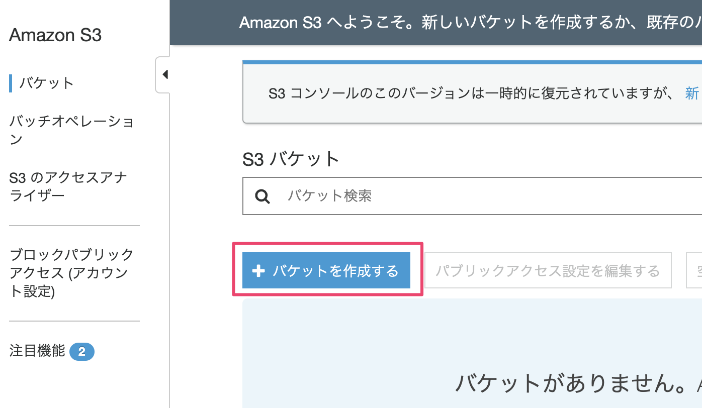 S3のダッシュボードの『バケットを作成する』を選択します。