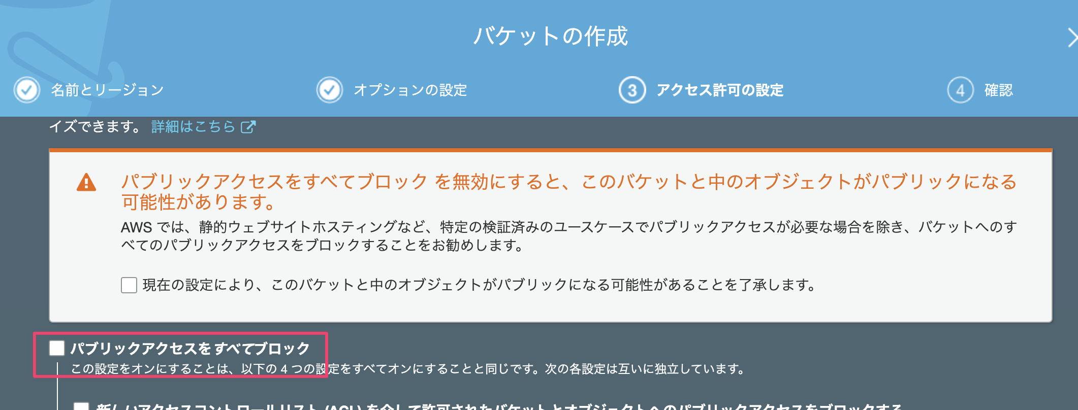 Webサイトを公開状態にするため、アクセス許可の設定で『パブリックアクセスをブロック』のチェックを外します。