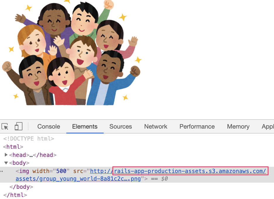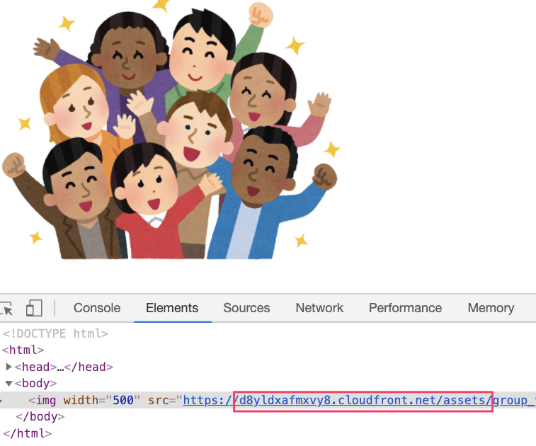 Railsアプリケーションの再起動後、ソースコードを確認するとCloudFront経由でファイルを表示していることがわかります。