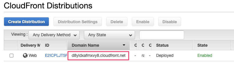 CloudFrontのドメイン名は一覧画面から確認できます。