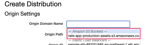 『Origin Domain Name』は、『Amazon S3 Buckets』に表示されているS3バケットのエンドポイント(xxx.s3.amazonaws.com)を指定します。