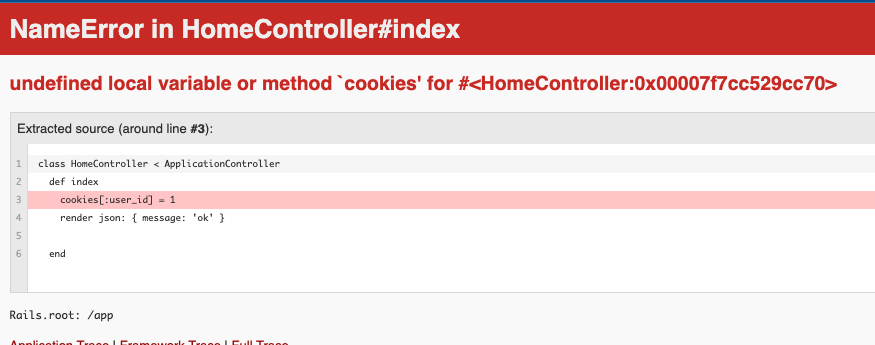 RailsアプリケーションでCookieを操作する場合はAction Controllerのcookiesメソッドを利用します。3 デフォルトのRails APIモードの場合、例えば以下のようなControllerにアクセスするとundefined local variable or method cookies for xxxxというNameErrorが返ってきます。