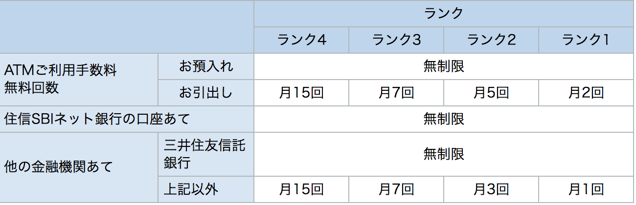 各ランクにおける手数料の無料回数は以下のようになっています。