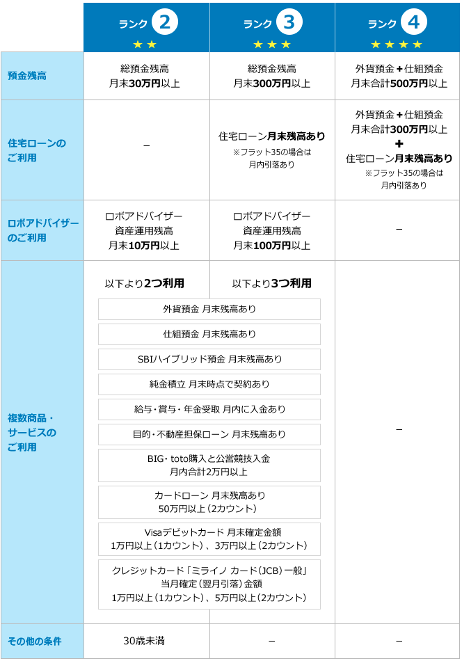 引用元: 住信SBIネット銀行『スマートプログラム』 スマートプログラムのランクは『預金残高』と『利用サービスの状況』によって決定し、表にすると以下のようになっています。