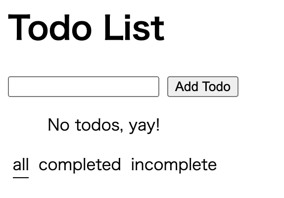フィルターのリンク(all/completed/incomplete)をクリックし、画面のTodoがフィルタリングされていればOKです。