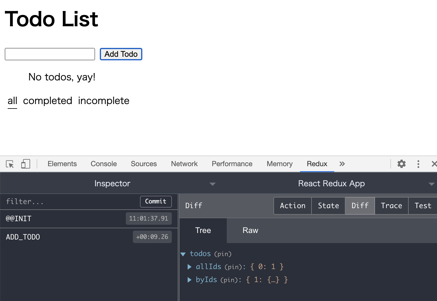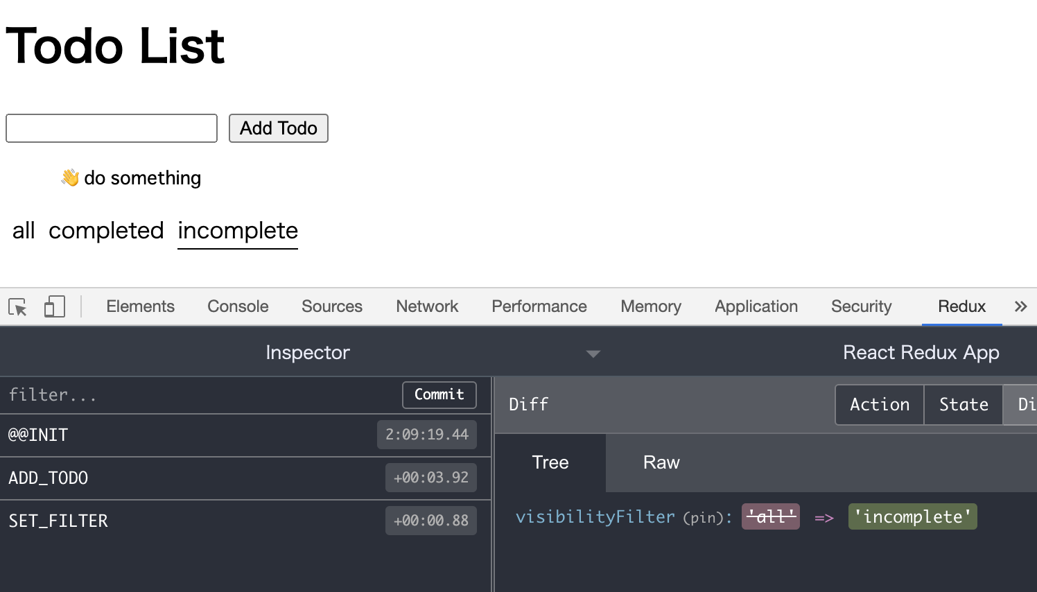 フィルターのリンク(all/completed/incomplete)をクリックし、Redux DevTools上でstateの変化が確認できればOKです。