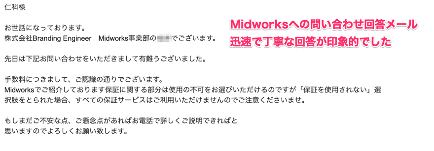 手数料に関するMidworksからの回答メール。とても丁寧な返事が好印象でした。そして、Midworksの手数料率については調整することが可能となっています。