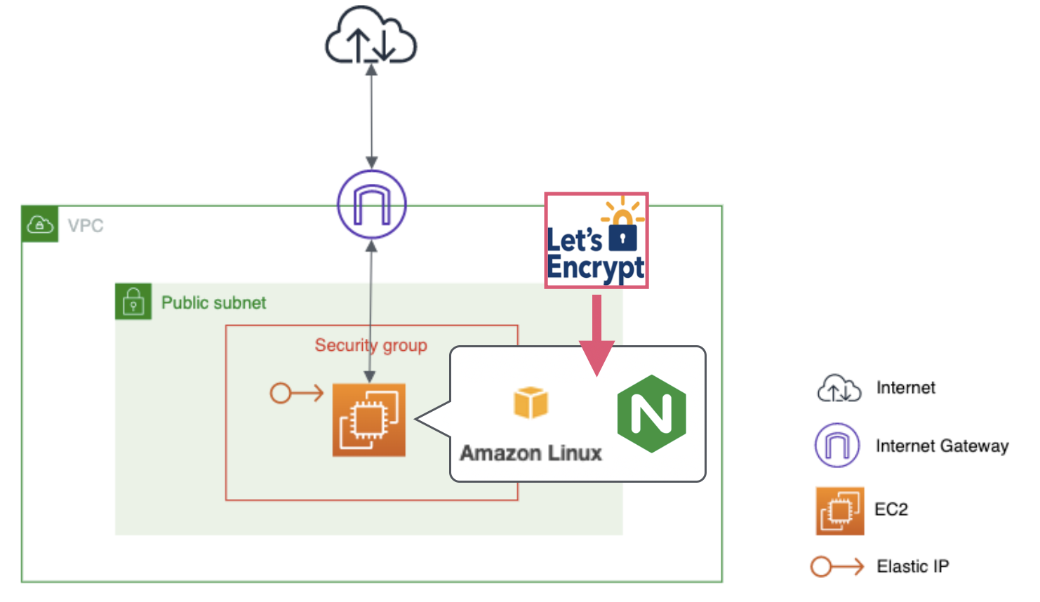 EC2インスタンスにインストールされたnginxにLet’s Encryptを導入し、httpsでアクセスできることをゴールとします。