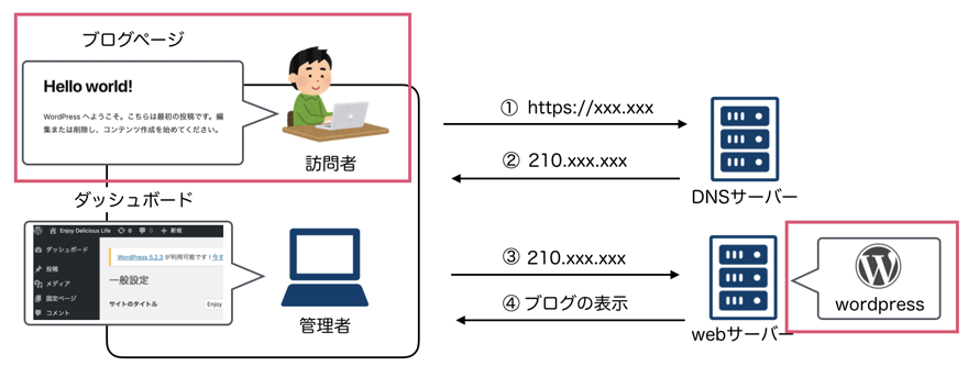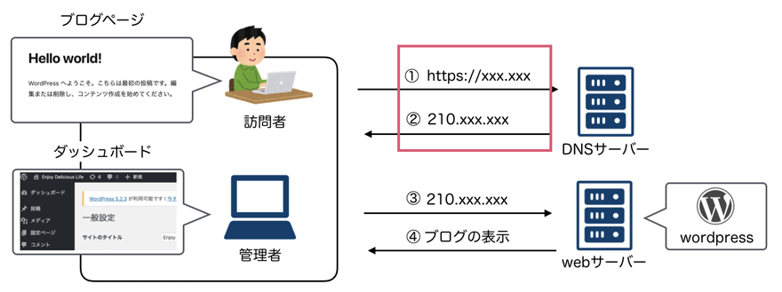 独自ドメインとサーバーの準備後、独自ドメインのDNS設定(後述)をし、サーバーにWordPressをインストールすることで、『https://xxx.xxx にアクセスするとブログがみられる』という状態になります。