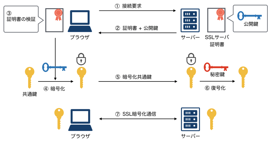 SSL暗号化通信には『公開鍵暗号方式による通信の確立』と『共通鍵暗号方式によるデータの受け渡し』の2つの仕組みが利用されています。