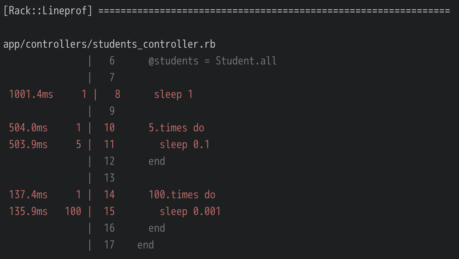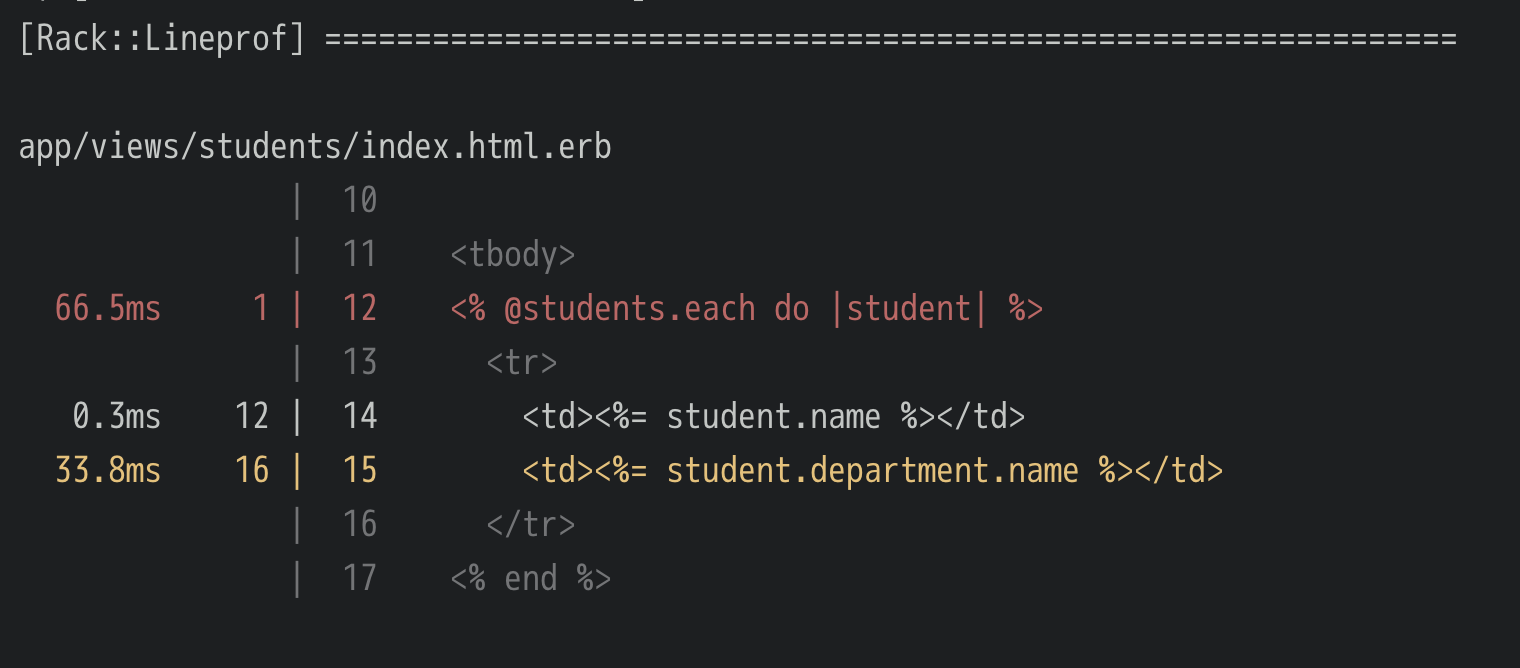 上記の設定後http://localhost:3000/studentsにアクセスすると、http://localhost:3000/students?lineprof=app/views/students/index.html.erbと同様の計測ができます。