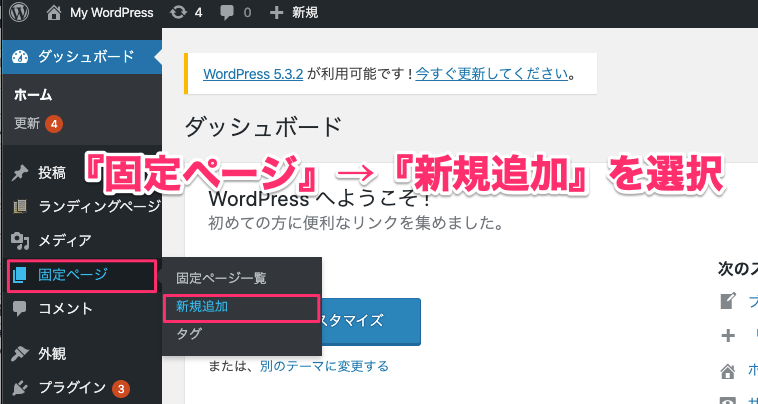 『固定ページ』の作成は『固定ページ』→『新規追加』から行います。