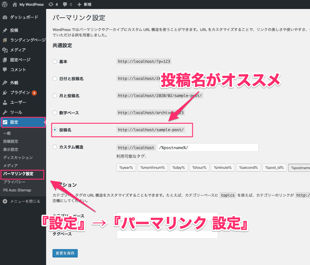 パーマリンクの設定は『設定』→『パーマリンク設定』で行います。オススメはスラッグを利用してパーマリンクを作成する『投稿名』のパターンです。