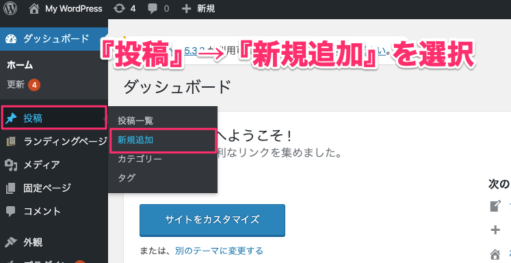 『投稿』の作成は『投稿』→『新規追加』から行います。