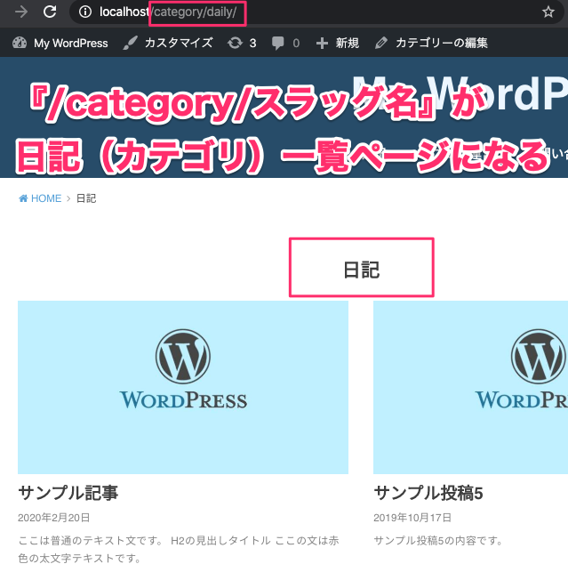 例えば、『日記』というカテゴリー名のスラッグを『daily』と設定した場合、/category/dailyのURLに『日記』カテゴリーの記事が一覧で表示されます。