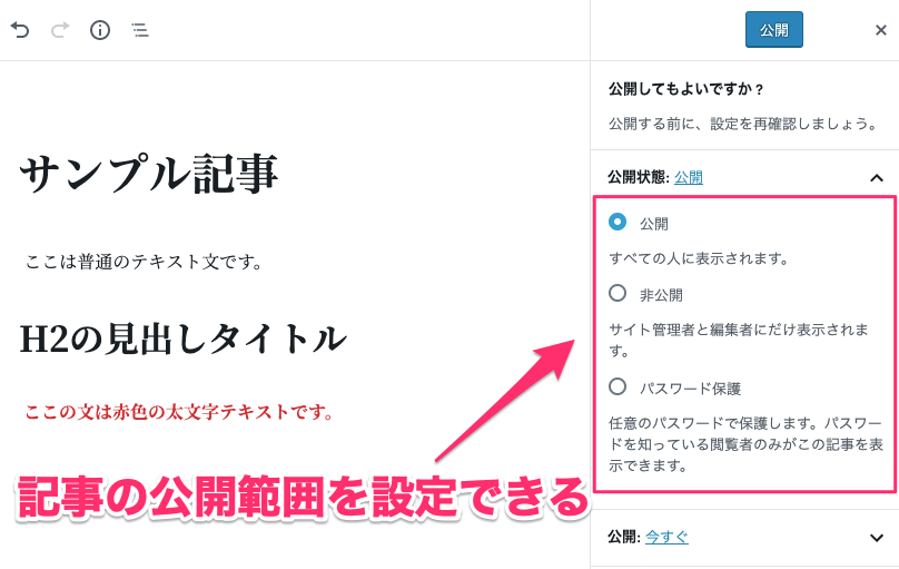 - 公開状態によって記事の公開範囲が決まる