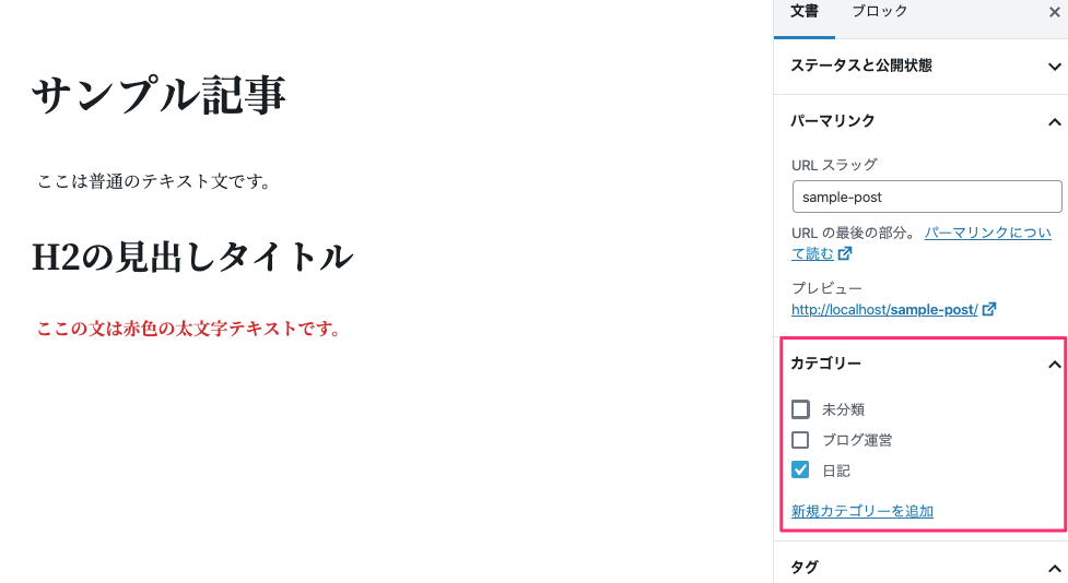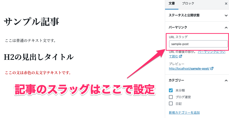記事のパーマリンクはサイドバーの『パーマリンク』から行います。今回はsample-postという名前をつけてみました。