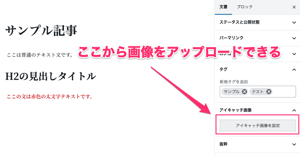 記事のアイキャッチ(サムネイル画像などともいう)は『アイキャッチ画像を設定』をクリックして画像をアップロードすることで設定できます。