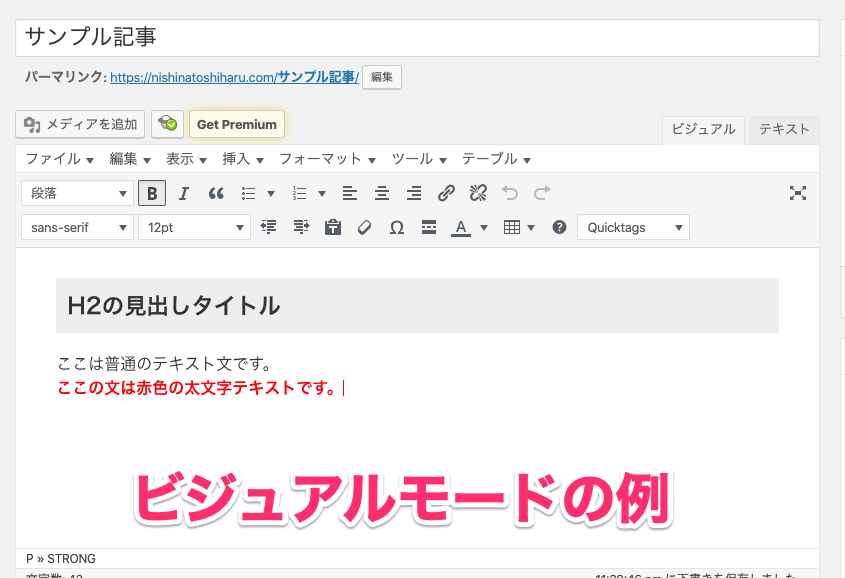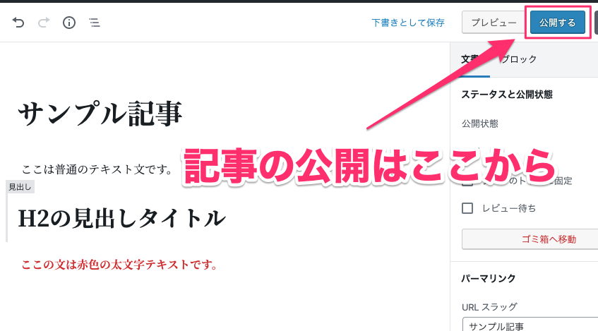 『プレビュー』を利用することで記事の見た目を確認することができます。