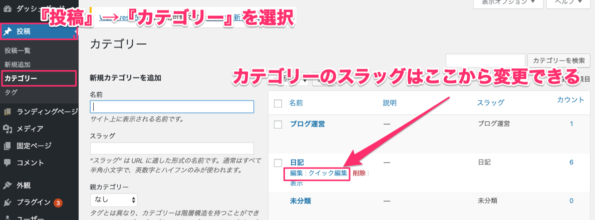 カテゴリーのスラッグの変更は『投稿』→『カテゴリー』から行います。