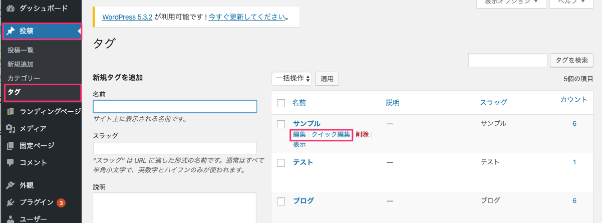 タグの場合は『投稿』→『タグ』から行います。