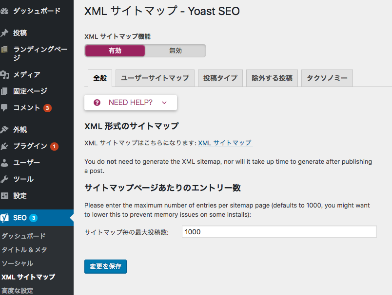 有効後、「SEO」の項目に「XMLサイトマップ」という項目が新しく表示されるのでこちらを選択します。
