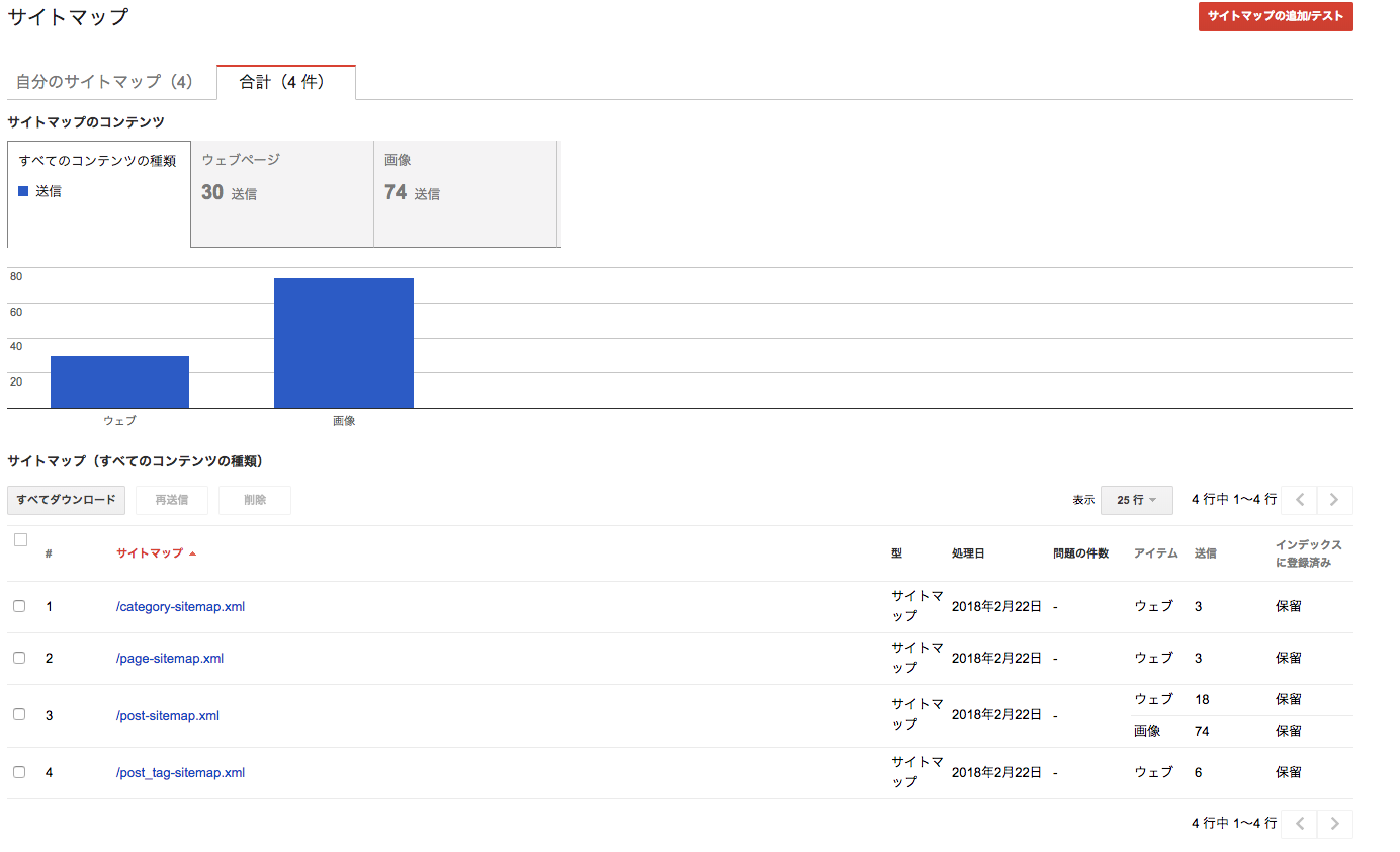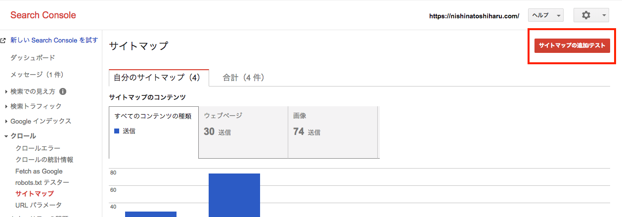 Google Search Console画面の「クロール」->「サイトマップ」と移動して「サイトマップの追加」を押します。